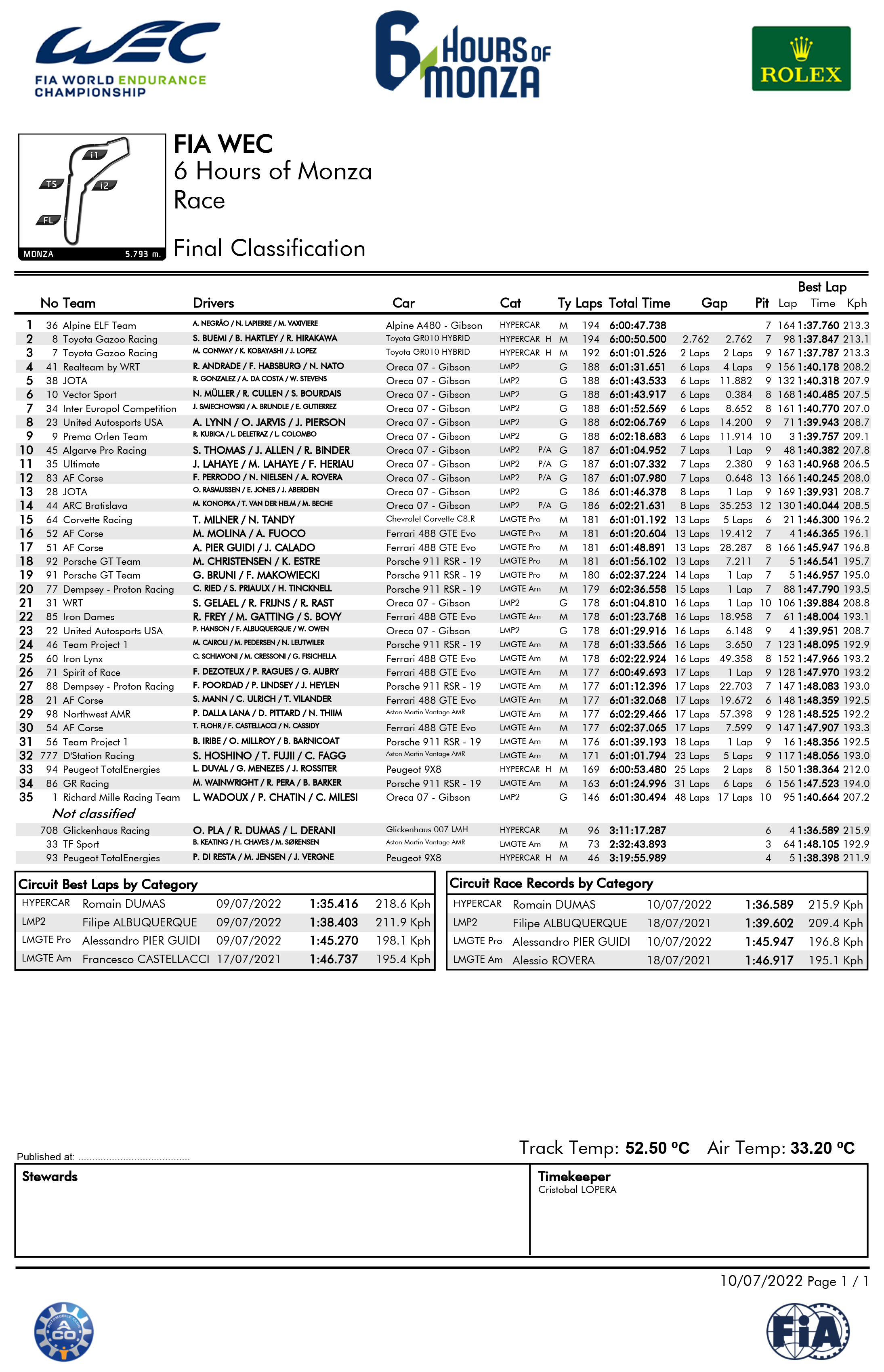 The No. 36 Hypercar Alpine ELF Team of Nicolas Lapierre, Andre Negrao and Matthieu Vaxiviere completed 194 laps and were overall winners in the 38-car field, followed in second and third by a pair of Toyota Gazoo Racing Toyota GR010 hybrids. The No. 8 of Sebastien Buemi, Brendon Hartley and Ryo Hirakawa beat sister car No. 7 of Mike Conway, Kamui Kobayashi and Jose Maria Lopez for runner-up honors. The margin of victory was 2.76 seconds.